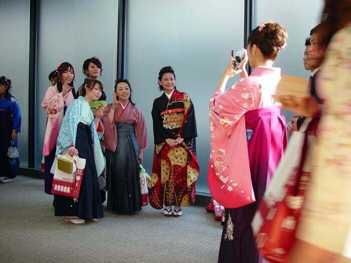 I don't know these girls, but they were all just dressed so prettily I had to take their picture of them having their picture taken. Young ladeez don't usually wear hakama kimonoes like this, so they must be all borrowed or rented for the occasion.